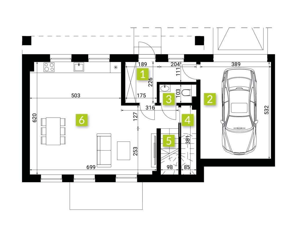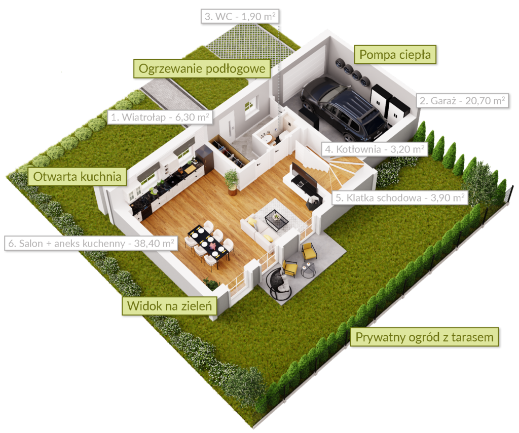 | 6 | Salon + aneks kuchenny | 38.4 m2 |