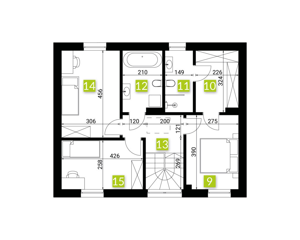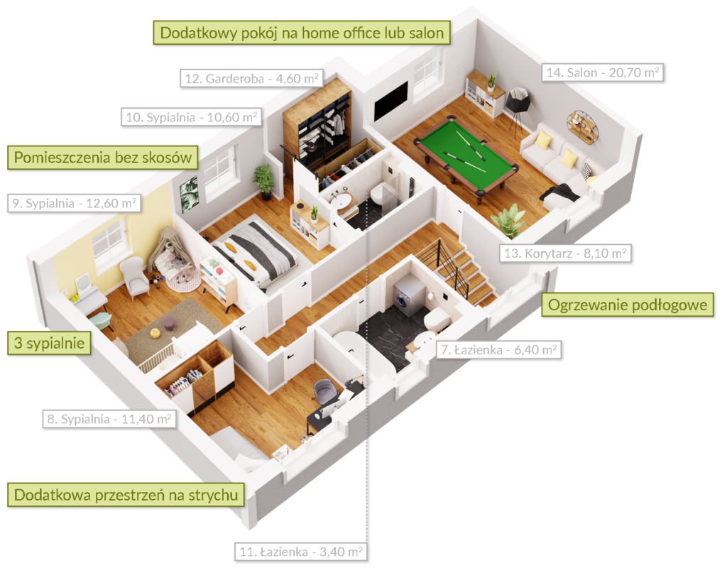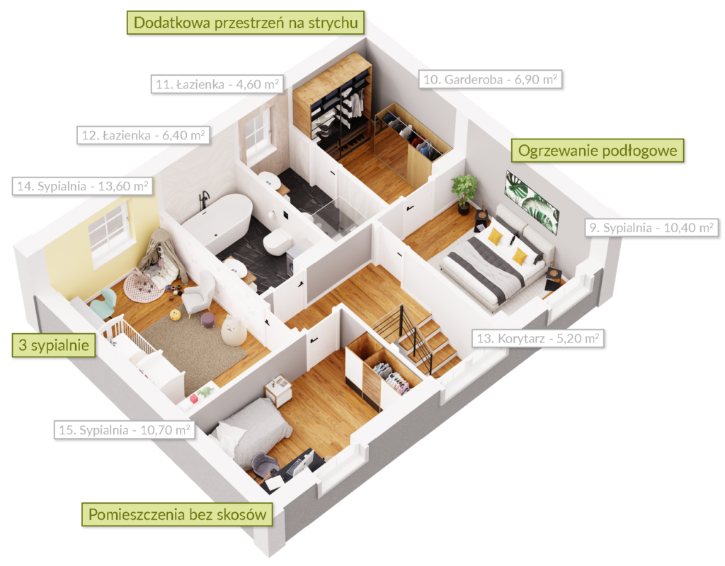 Domy wyróżniają się bardzo funkcjonalnym układem. Przewidziane są na potrzeby rodziny 2+1, 2+2 lub 2+3.