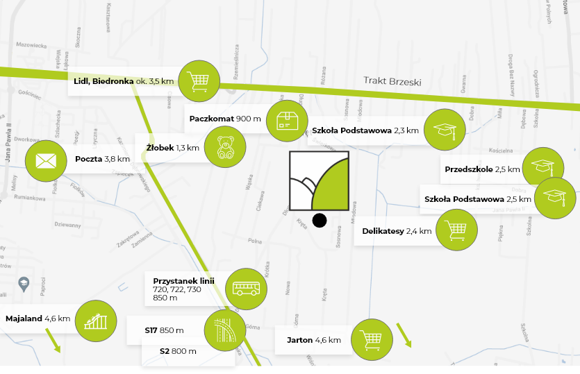 Zakręt to zielona okolica, która dynamicznie się rozwija. Położenie osiedla łączy w sobie korzyści mieszkania w spokojnym, otoczonym naturą miejscu i dobrej komunikacji z Warszawą. Do sklepów, szkoły, centrów rozrywki dotrzesz w kilka minut. Przystanek busa szkolnego – obok na ul. Długiej, która niebawem będzie remontowana.